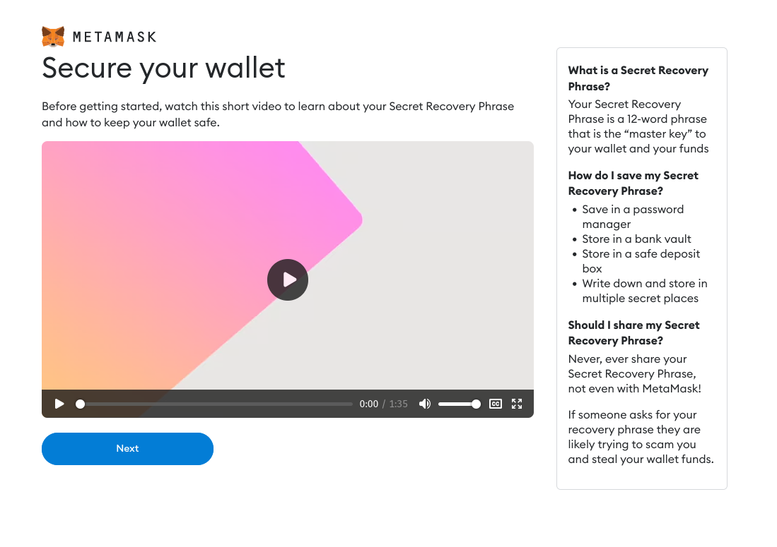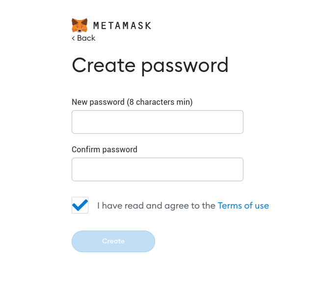 Before creating a wallet, we need to secure MetaMask with a password. Coose one that is more than 8 characters long. For more info on Metamask & passwords, read this help article