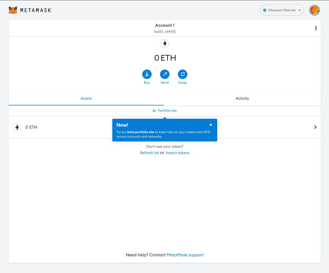 Hit 'Continue' and you'll see the main MetaMask screen. This gives an overview of your 'account' or wallet.