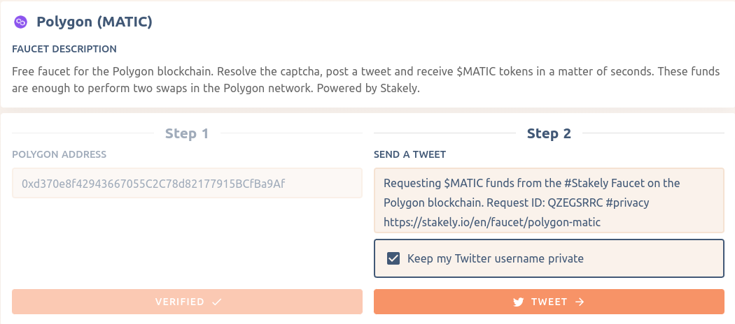 Once you've made your tweet, the faucet verifies your tweet and in a few moments, check your MetaMask account and you'll see your MATIC balance update.